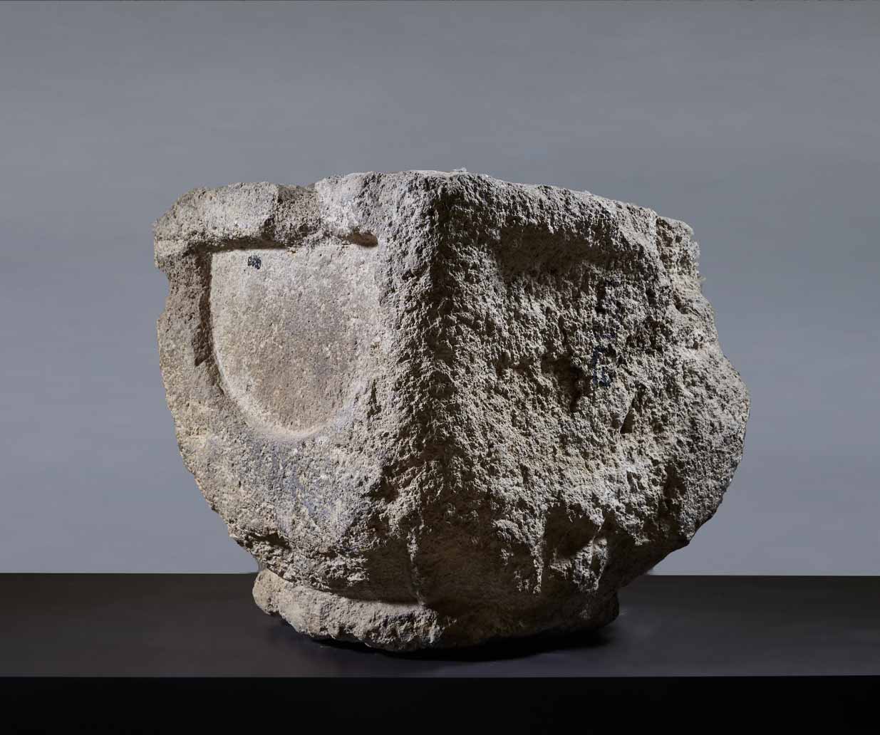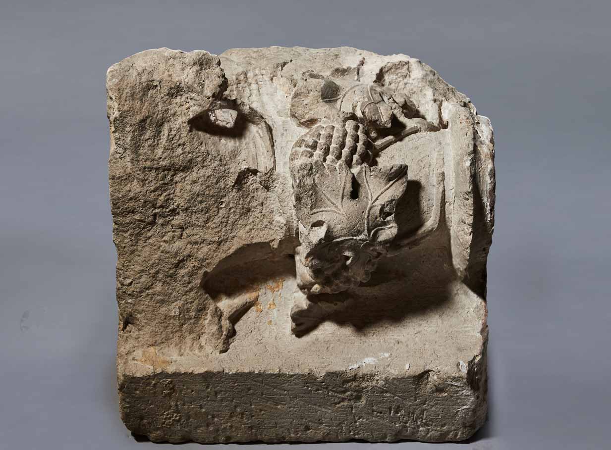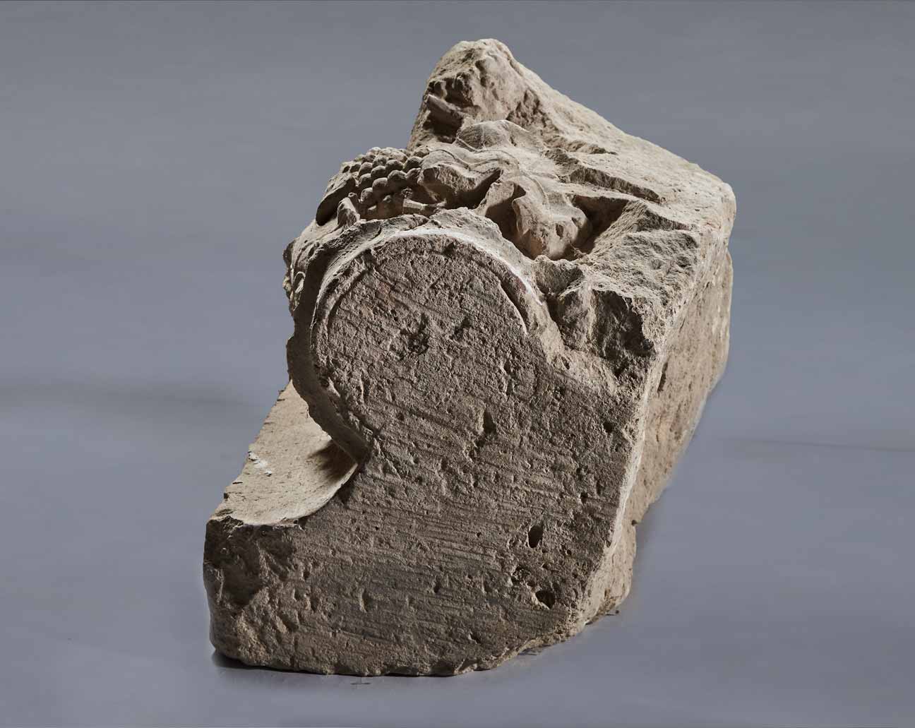 Homorlatból kiemelkedő háromnegyedoszlopfő, felületén szőlőindával, szőlőlevelekkel és fürtökkel.